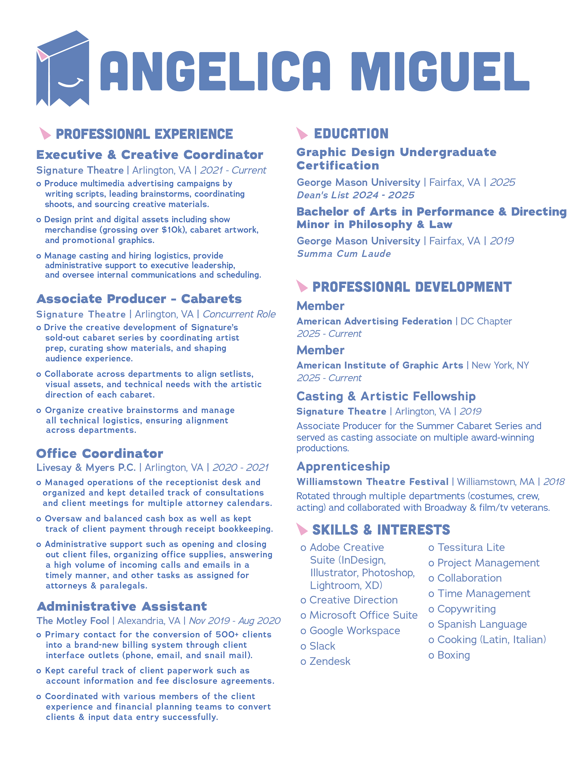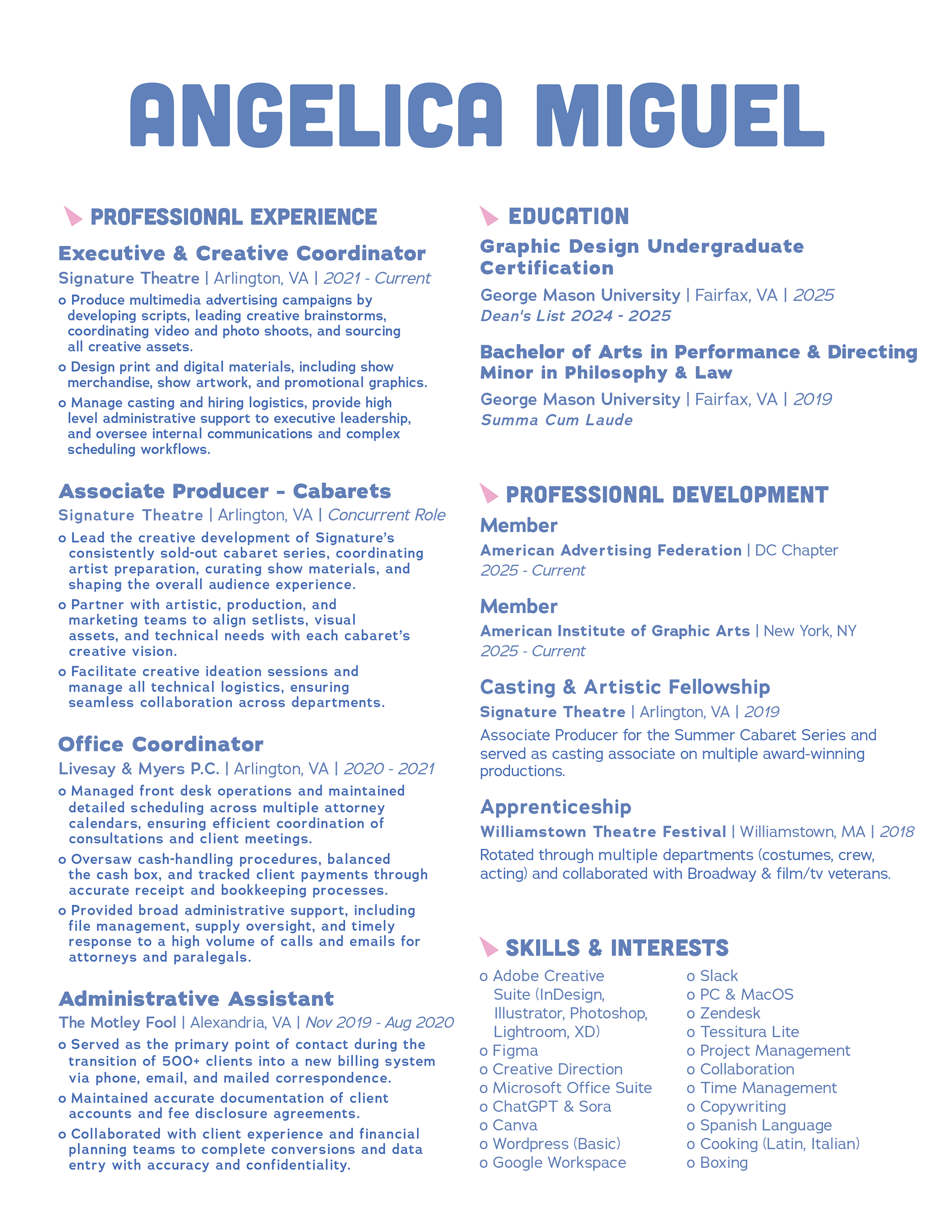 I'm Angelica Miguel - a Cuban-American graphic designer, storyteller, and creative with a background in theatre and digital content. My mission is to design with heart, honesty, and intention - creating work that connects people through empathy, uplifts communities, and celebrates the freedom of creative expression.